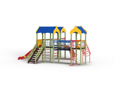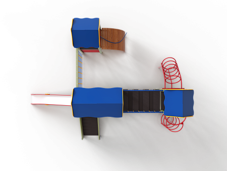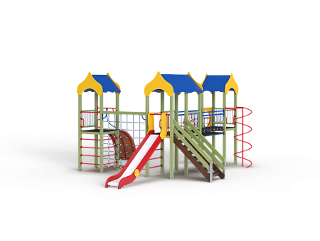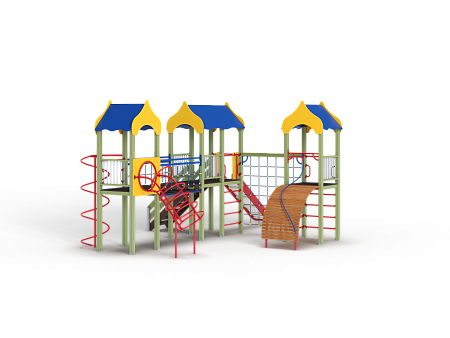Детский игровой комплекс состоит из трех башен. На первой башне установлены альпинистская стенка с перекладиной и канатом, шест прямой, ограждение из бруса с перекладинами и шведская стенка. На второй башне установлена лестница, горка и два ограждения из бруса с перекладинами . Первая и вторая башня соединяются полипропиленовой сеткой. На третьей башне установлено ограждение из бруса с перекладинами, шест спираль и спираль наклонная. Вторая и третья башни соединены подвесным мостом.