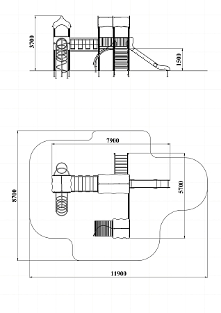 Детский игровой комплекс состоит из трех башен. На первой башне установлены альпинистская стенка с перекладиной и канатом, шест прямой, ограждение из бруса с перекладинами и шведская стенка. На второй башне установлена лестница, горка и два ограждения из бруса с перекладинами . Первая и вторая башня соединяются полипропиленовой сеткой. На третьей башне установлено ограждение из бруса с перекладинами, шест спираль и спираль наклонная. Вторая и третья башни соединены подвесным мостом.