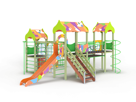 Детский игровой комплекс состоит из трёх башен с крышами, имеет художественное оформление в стиле граффити. На первой башне установлена альпинистская стенка с перекладиной и канатом, шведская стенка, шест, ограждение и ручки вспомогательные. На второй башне установлены горка, ограждения, лестница, шведская стенка. На третьей башне установлены спираль наклонная, ограждение, шест спираль, ручки вспомогательные и перекладина. Первая и вторая башни соединены сеткой полипропиленовой, вторая и третья соединены подвесным качающимся мостом. К первой башне присоединен с помощью бум бревна гимнастический комплекс с рукоходом, сеткой вертикальной металлической, двумя шведскими стенками и декоративными арками.