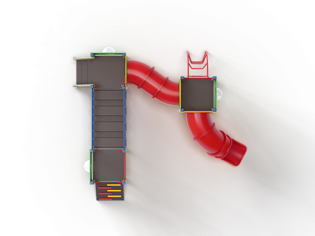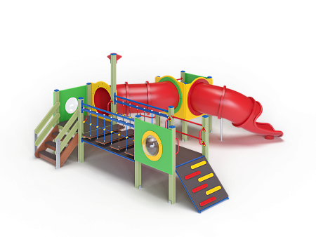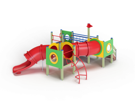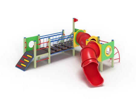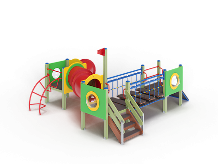 Детский игровой комплекс состоит из трех башен. На первой башне установлены трап, ограждение с иллюминатором, ручки вспомогательные, перекладины. На второй башне установлены лестница, ручки вспомогательные, ограждение с иллюминатором и два декоративных фанерных флажка. На третьей башне установлены лиана наклонная, горка-труба пластиковая, ограждение с иллюминатором и перекладина. Первая и вторая башня соединены подвесным качающимся мостом, вторая и третья башни соединены пластиковой изогнутой трубой переходом.