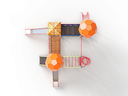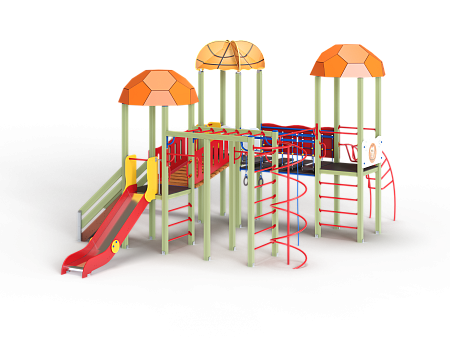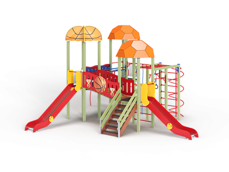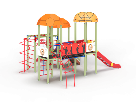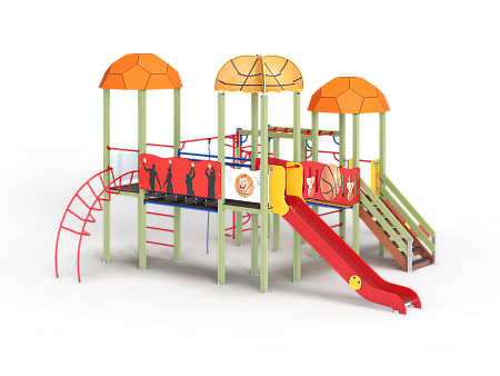 Детский игровой комплекс состоит из трех башен с крышами, имеет художественное оформление в стиле баскетбола. На первой башне установлены лестница, горка, вынесенная шведская стенка с рукоходом, перекладиной с гимнастическими кольцами и шестом спиралью. На второй башне установлена горка и фанерное ограждение. На третьей башне установлена лиана, ограждение фанерное и шведская стенка. Первая и вторая башни соединяются разновысоким мостом с фанерными перилами. Вторая и третья башни соединены подвесным качающимся мостом с фанерным ограждением.