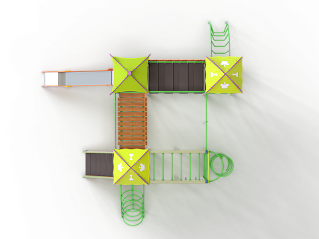 Детский игровой комплекс состоит из трех башен с крышами, имеет художественное оформление в стиле граффити. На первой башне установлена лестница, спираль наклонная, ручки вспомогательные, ограждение с круглым лазом, вынесенная шведская стенка с рукоходом, перекладиной с гимнастическими кольцами и шестом спиралью. На второй башне установлена горка и фанерное ограждение. На третьей башне установлена лиана, ручки вспомогательные, ограждение фанерное с декоративными элементам и шведская стенка. Первая и вторая башни соединяются разновысоким мостом с фанерными перилами. Вторая и третья башни соединены подвесным качающимся мостом с фанерным ограждением.