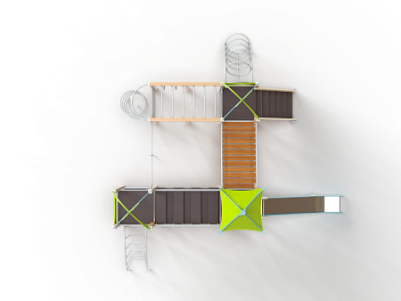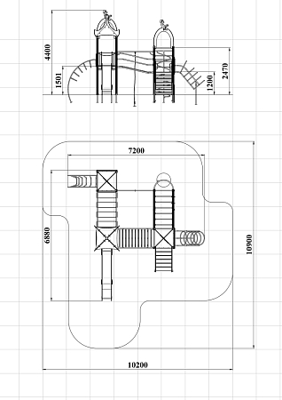 Детский игровой комплекс состоит из трех башен с крышами. На первой башне установлена лестница, спираль наклонная, ручки вспомогательные, ограждение с круглым лазом, вынесенная шведская стенка с рукоходом, перекладиной с гимнастическими кольцами и шестом спиралью. На второй башне установлена горка и фанерное ограждение. На третьей башне установлена лиана, ручки вспомогательные, ограждение фанерное и шведская стенка. Первая и вторая башни соединяются разновысоким мостом с металлическими перилами. Вторая и третья башни соединены подвесным качающимся мостом.