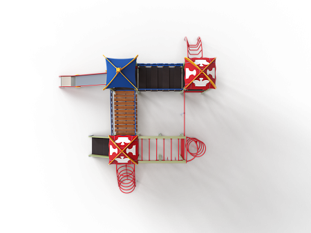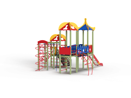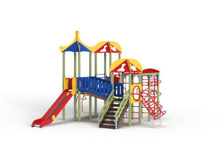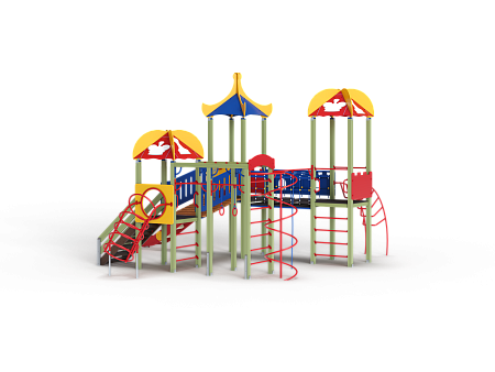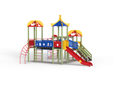 Детский игровой комплекс состоит из трех башен с крышами. На первой башне установлена лестница, спираль наклонная, ручки вспомогательные, ограждение с круглым лазом, вынесенная шведская стенка с рукоходом, перекладиной с гимнастическими кольцами и шестом спиралью. На второй башне установлена горка и фанерное ограждение с декоративными элементами. На третьей башне установлена лиана, ручки вспомогательные, ограждение фанерное с декоративными элементам и шведская стенка. Первая и вторая башни соединяются разновысоким мостом с фанерными перилами. Вторая и третья башни соединены подвесным качающимся мостом с фанерным ограждением и декоративными элементами.