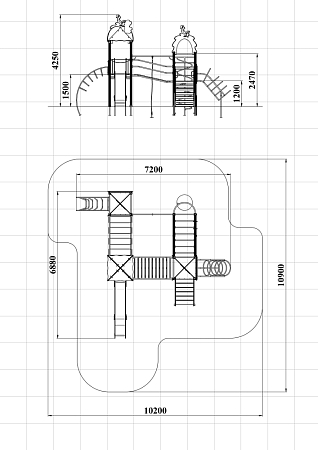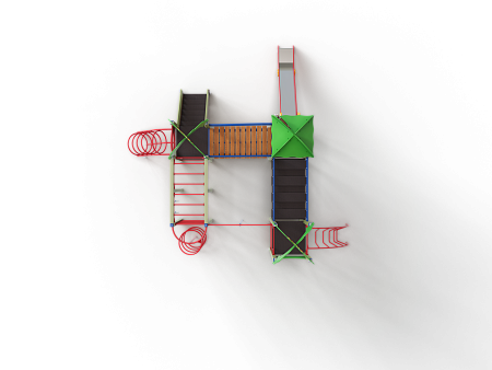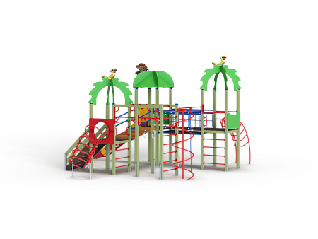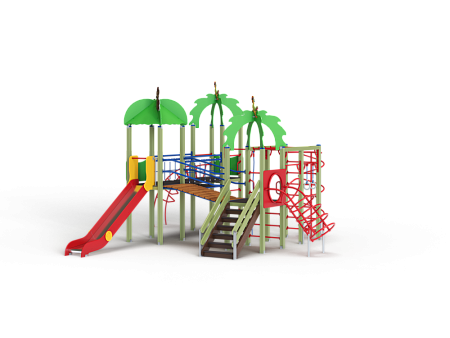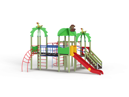 Детский игровой комплекс состоит из трех башен с крышами. На первой башне установлена лестница, спираль наклонная, ручки вспомогательные, ограждение с круглым лазом, вынесенная шведская стенка с рукоходом, перекладиной с гимнастическими кольцами и шестом спиралью. На второй башне установлена горка и фанерное ограждение. На третьей башне установлена лиана, ручки вспомогательные, ограждение фанерное и шведская стенка. Первая и вторая башни соединяются разновысоким мостом с металлическими перилами. Вторая и третья башни соединены подвесным качающимся мостом.