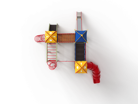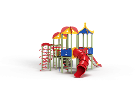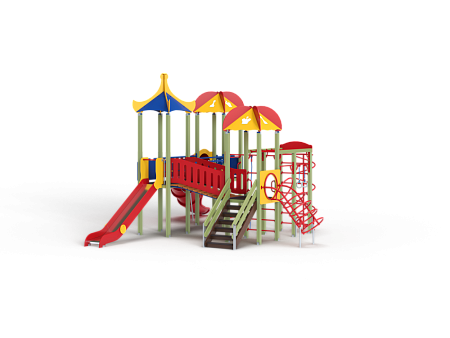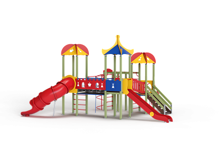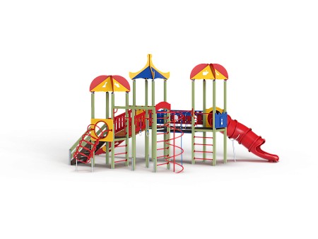 Детский игровой комплекс состоит из трех башен с крышами. На первой башне установлена лестница, спираль наклонная, ручки вспомогательные, ограждение с круглым лазом, вынесенная шведская стенка с рукоходом, перекладиной с гимнастическими кольцами и шестом спиралью. На второй башне установлена горка и фанерное ограждение с декоративными элементами. На третьей башне установлена горка-труба пластиковая, ручки вспомогательные, ограждение фанерное с декоративными элементам и шведская стенка. Первая и вторая башни соединяются разновысоким мостом с фанерными перилами. Вторая и третья башни соединены подвесным качающимся мостом с фанерным ограждением и декоративными элементами.