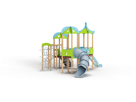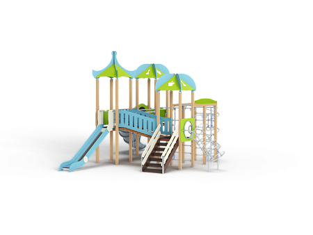 Детский игровой комплекс состоит из трех башен с крышами. На первой башне установлена лестница, спираль наклонная, ручки вспомогательные, ограждение с круглым лазом, вынесенная шведская стенка с рукоходом, перекладиной с гимнастическими кольцами и шестом спиралью. На второй башне установлена горка и фанерное ограждение с декоративными элементами. На третьей башне установлена горка-труба пластиковая, ручки вспомогательные, ограждение фанерное с декоративными элементам и шведская стенка. Первая и вторая башни соединяются разновысоким мостом с фанерными перилами. Вторая и третья башни соединены подвесным качающимся мостом с фанерным ограждением и декоративными элементами.