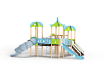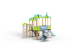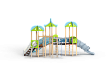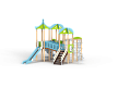 Детский игровой комплекс состоит из трех башен с крышами. На первой башне установлена лестница, спираль наклонная, ручки вспомогательные, ограждение с круглым лазом, вынесенная шведская стенка с рукоходом, перекладиной с гимнастическими кольцами и шестом спиралью. На второй башне установлена горка и фанерное ограждение с декоративными элементами. На третьей башне установлена горка-труба пластиковая, ручки вспомогательные, ограждение фанерное с декоративными элементам и шведская стенка. Первая и вторая башни соединяются разновысоким мостом с фанерными перилами. Вторая и третья башни соединены подвесным качающимся мостом с фанерным ограждением и декоративными элементами.