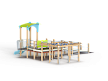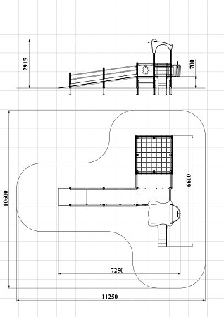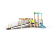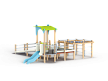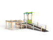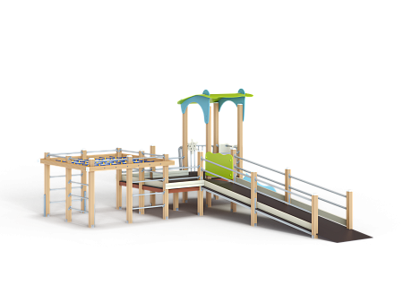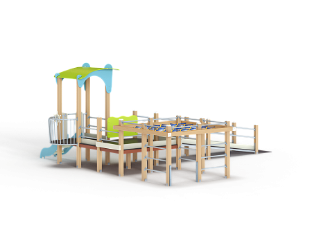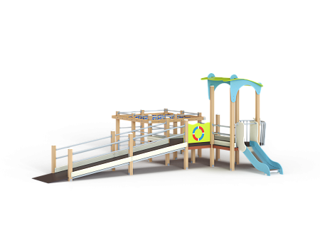 Детский игровой комплекс предназначен для детей с ограниченными физическими возможностями, он состоит из двух сдвоенных открытых башен и башни с фасонной крышей. На башне установлена горка, балкон с фанерным штурвалом, металлическое ограждение из перекладин. По периметру комплекса установлены ограждения из металлических перекладин и одного фанерного ограждения с декоративным элементом. Вход на площадку осуществлен в виде двойного наклонного трапа с металлическими перилами. Сбоку от площадки расположен спортивный комплекс, состоящий из столбов, шведских стенок и горизонтальной полипропиленовой сетки. Ограждением комплекса также служит брус расположенный по периметру комплекса над ламинированными полами.