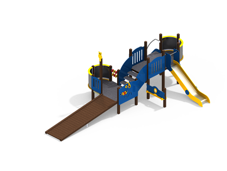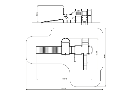 Комплекс состоит из двух разновысоких башен с площадками, соединенных маршевым переходом. На первой башне установлены горка, балкон, лестница и ограждения. На второй башне установлены ограждения, детские счеты, балкон и трап. Все металлические элементы выполнены из стали с оцинкованным покрытием. Оцинковка металла производится методом электрохимической гальванизации. Ограждения, декоративные элементы, борта и ограждения горки выполнены из HPL пластика.