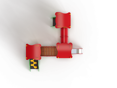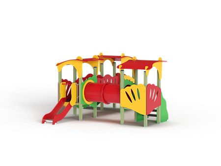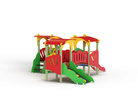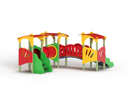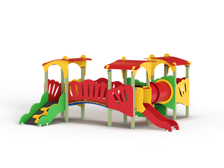 Детский игровой комплекс состоит из трёх башен с фасонными крышами. На первой башне установлена лестница и фасонные фанерные ограждения. На второй башне установлена горка и фасонное фанерное ограждение . На третьей башне установлены фигурный трап и фасонные фанерные ограждения. Первая и вторая башни соединены пластиковой трубой переходом, вторая и третья соединены радиусным мостом с фасонными фанерными перилами.