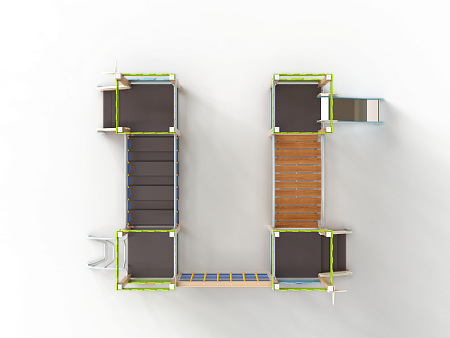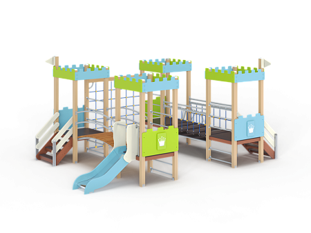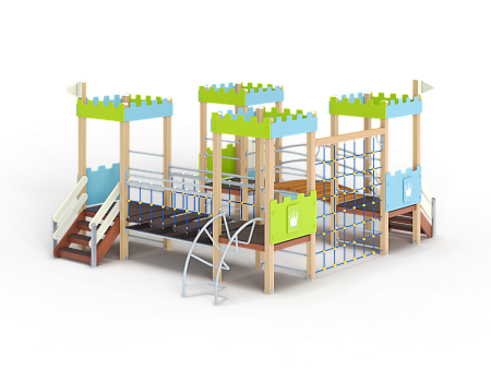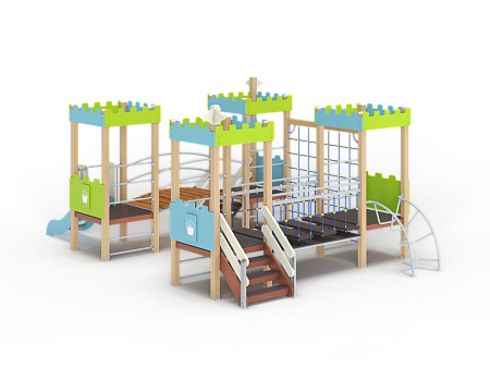 Детский игровой комплекс состоит из четырёх башен с крышами. На первой башне установлена ограждение фанерное с декоративной накладкой, лестница, перекладины и декоративные флажки. На второй башне установлено ограждение фанерное с декоративной накладкой, лиана наклонная и перекладины. На третьей башне установлено ограждение фанерное с декоративной накладкой, декоративные флажки и лестница. На четвертой башне установлено ограждение фанерное с декоративной накладкой, перекладины и горка. Первая башня соединена подвесным качающимся мостом со второй. Вторая соединяется с третьей сеткой полипропиленовой. Третья соединяется с четвёртой мостом радиусным с металлическими перилами.
