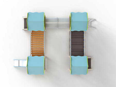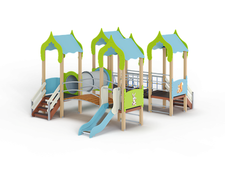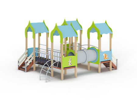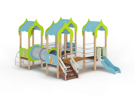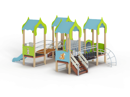 Детский игровой комплекс состоит из четырёх башен с крышами. На первой башне установлена ограждение фанерное с художественным оформлением, лестница, перекладины. На второй башне установлено ограждение фанерное с художественным оформлением, лиана наклонная и перекладины. На третьей башне установлено ограждение фанерное с художественным оформлением и лестница. На четвертой башне установлено ограждение фанерное с художественным оформлением, перекладины и горка. Первая башня соединена подвесным качающимся мостом со второй. Вторая соединяется с третьей пластиковой трубой переходом. Третья соединяется с четвёртой мостом радиусным с металлическими перилами.