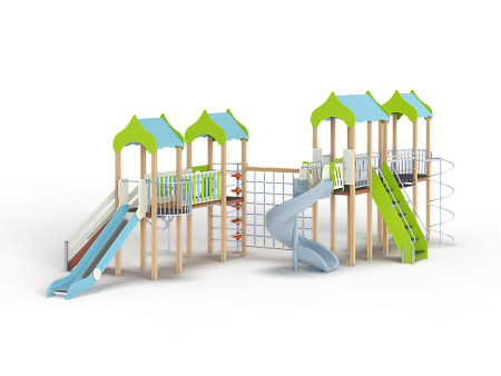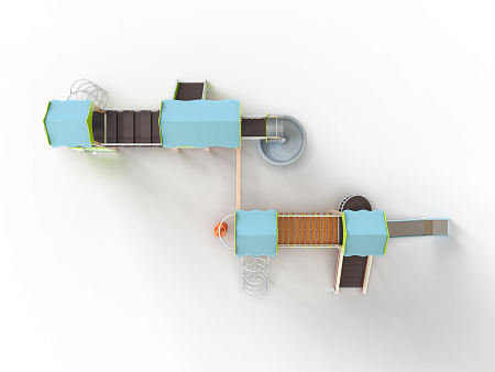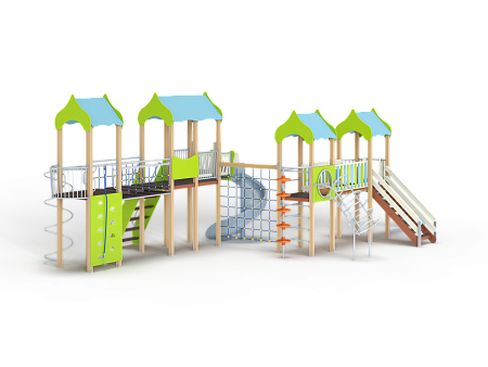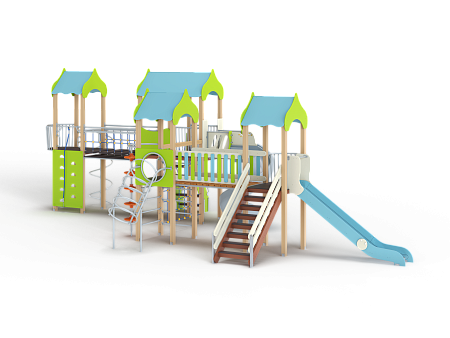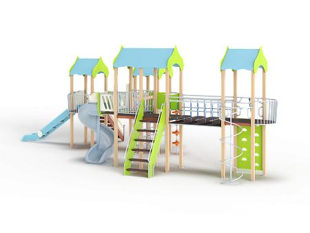 Детский игровой комплекс состоит из четырёх башен с крышами. На первой башне установлена лестница, горка, балкон, перекладина, На второй башне установлены две шведских стенки,  шест с пластиковыми колесами, фанерное ограждение с круглым вырезом, спираль, ручки вспомогательные и перекладины. На третьей сдвоенной башне установлены горка винтовая пластиковая, ограждения металлические, ограждение фанерное, лестница с металлическими поручнями. На четвертой башне установлены альпинистская стенка с перекладиной и канатом, шест спираль, балкон, шведская стенка, перекладина и вспомогательные ручки. Первая и вторая башни соединены прямым мостом с фанерными перилами из балясин, вторая и третья сеткой полипропиленовой, третья и четвертая подвесным качающимся мостом.
