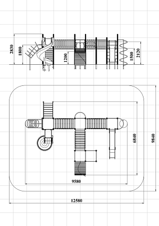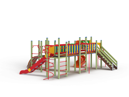Детский игровой комплекс состоит из четырёх башен. На первой башне установлена лестница, горка винтовая пластиковая, ограждение с круглым лазом, спираль. На второй башне установлены шведская стенка, шест, ручки вспомогательные и перекладина. На третьей башне установлены горка, шест спираль, две шведские стенки, ручки вспомогательные, перекладины. На четвертой башне уста-новлены трап-барабан с перекладиной и канатом, две шведские стенки, перекладины и вспомогательные ручки. Четвертая башня имеет продолжение в виде вынесенной шведской стенки и соединяется с ней перекладинами усиленными. Первая и вторая башни соединены прямым мостом с фанерными перилами из балясин, вторая и третья прямым мостом с фанерными перилами из балясин, вторая и четвертая разновысоким мостом с фанерными перилами..