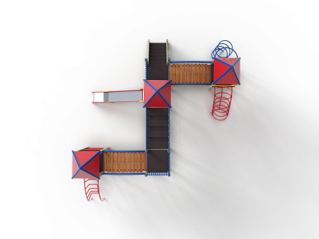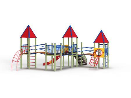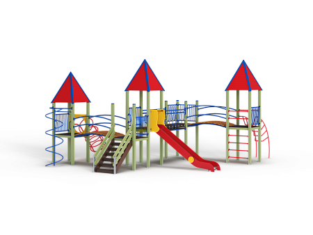 Детский игровой комплекс состоит из пяти башен, на трёх башнях установлена пирамидальная крыша. На первой башне установлена спираль, крыша, ограждение с круглым лазом, шест спираль, ручки вспомогательные, ограждение металлическое. На второй башне (полубашня) установлены ограждение металлическое и лестница. На третьей башне установлены крыша, горка, ручки вспомогательные и ограждение металлическое. На четвертой башне установлены два ограждения металлических. На пятой башне установлены крыша, металлическое ограждение,  шведская стенка и лиана наклонная. Первая и вторая башни соединены радиусным мостом с металлическими перилами. Третья и четвертая соеденины подвесным качающимся мостом. Четвертая и пятая башни соединены радиусным мостом с металлическими перилами.