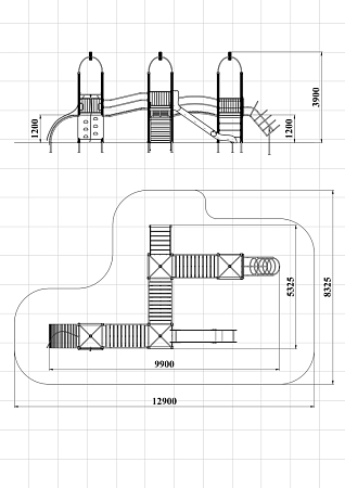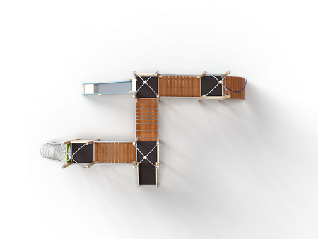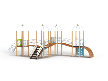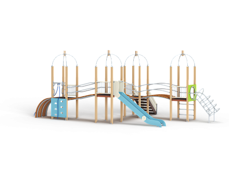 Детский игровой комплекс состоит из четырех башен с металлическими крышами. На первой башне установлена спираль, ограждение фанерное с круглым лазом, шведская стенка и ограждение из бруса с перекладинами. На второй башне установлены ограждение из бруса с перекладинами, лестница. На третьей башне установлена горка, ограждение из бруса с перекладинами. На четвертой башне установлены ограждение из бруса с перекладинами, альпинистская стенка, перекладины с канатом, трап барабан, вспомогательные ручки. Первая и вторая башни соединены радиусным мостом с металлическими перилами, вторая с третьей, и третья с четвертой разновысокими мостами с металлическими перилами.