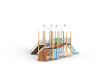 Детский игровой комплекс состоит из четырех башен с металлическими крышами. На первой башне установлена спираль, ограждение фанерное с круглым лазом, шведская стенка и ограждение из бруса с перекладинами. На второй башне установлены ограждение из бруса с перекладинами, лестница. На третьей башне установлена горка, ограждение из бруса с перекладинами. На четвертой башне установлены ограждение из бруса с перекладинами, альпинистская стенка, перекладины с канатом, трап барабан, вспомогательные ручки. Первая и вторая башни соединены радиусным мостом с металлическими перилами, вторая с третьей, и третья с четвертой разновысокими мостами с металлическими перилами.