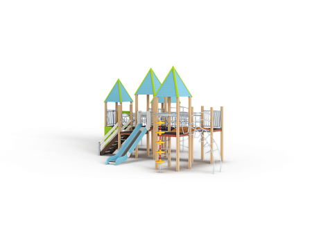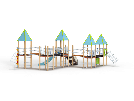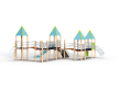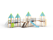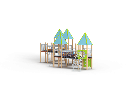 Детский игровой комплекс состоит из шести башен, на четырёх башнях установлена крыша. На первой башне установлена крыша, спираль наклонная, ограждение с лазом, ручки вспомогательные, ограж-дение металлическое, альпинистская стенка с пере-кладиной и канатом. На второй башне установлены крыша, ограждение металлическое, шест спираль, перекладина и ручки вспомогательные. На третьей башне (полубашня) установлены лестница, перекла-дины и шведская стенка. На четвертой установлены крыша, ограждение металлическое, горка и ручки вспомогательные. На пятой два металлических ограждения. На шестой установлены крыша, швед-ская стенка, лиана наклонная, шест с колесами, пе-рекладины и ручки вспомогательные. Первая и вто-рая башни соединены подвесным мостом, вторая и третья радиусным мостом, четвертая и пятая под-весным мостом, пятая и шестая радиусным мостом. Все резьбовые соединения должны быть закрыты разноцветными пластиковыми заглушками.
