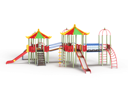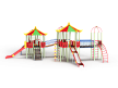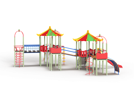 Детский игровой комплекс состоит из пяти башен. На двух башнях установлена крыша в форме восьмигранной пагоды, на трёх башнях установлена крыша металлическая со столбом. На восьмигранных башнях установлены горки, шест с колесами пластиковыми, ручки вспо-могательные, лестница и фанерные ограждения. На башнях с металлической крышей установлены шест, лиана, ручки вспомогательные, трап барабан с перекладиной и канатом, шест спираль, перекладины и фанерные ограждения. Башни соединены четырьмя мостами: наклонным, подвесным и двумя радиусными мостами с металическими перилами.