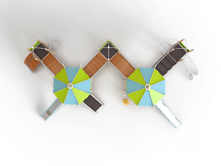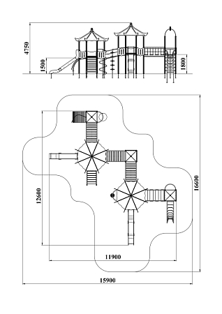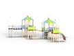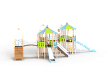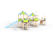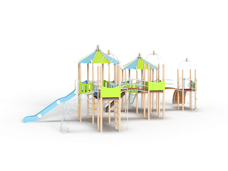 Детский игровой комплекс состоит из пяти башен. На двух башнях установлена крыша в форме восьмигранной пагоды, на трёх башнях установлена крыша металлическая со столбом. На восьмигранных башнях установлены горки, шест с колесами пластиковыми, ручки вспо-могательные, лестница и фанерные ограждения. На башнях с металлической крышей установлены шест, лиана, ручки вспомогательные, трап барабан с перекладиной и канатом, шест спираль, перекладины и фанерные ограждения. Башни соединены четырьмя мостами: наклонным, подвесным и двумя радиусными мостами с металическими перилами.