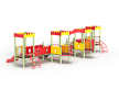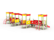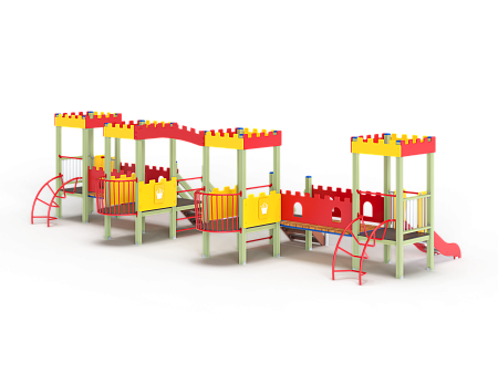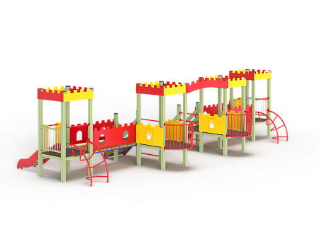 Детский игровой комплекс состоит из четырёх ба-шен с крышами. На первой башне установлена горка, перекладина, лиана и ограждение фанерное с декоративными накладками. На второй башне установлено ограждение фанерное с декоративными накладками, лестница, перекладины, балкон. На третьей башне установлено ограждение фанерное с декоративными накладками, лестница, перекладины, балкон. На четвертой башне установлена горка, перекладина, лиана и ограждение фанерное с декоративными накладками.  Первая башня соединена со второй прямым мостом с фанерными перилами, третья соединяется с четвертой прямым мостом с фанерными перилами. Между второй и третьей башней установлена декоративная зубчатая фанерная арка, на уровне фасадов крыш.