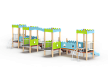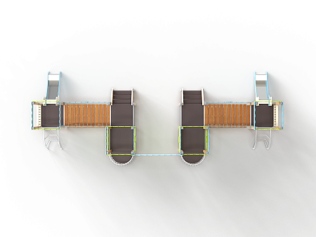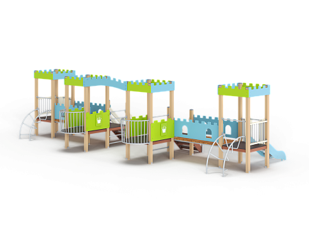Детский игровой комплекс состоит из четырёх ба-шен с крышами. На первой башне установлена горка, перекладина, лиана и ограждение фанерное с декоративными накладками. На второй башне установлено ограждение фанерное с декоративными накладками, лестница, перекладины, балкон. На третьей башне установлено ограждение фанерное с декоративными накладками, лестница, перекладины, балкон. На четвертой башне установлена горка, перекладина, лиана и ограждение фанерное с декоративными накладками. Первая башня соединена со второй прямым мостом с фанерными перилами, третья соединяется с четвертой прямым мостом с фанерными перилами. Между второй и третьей башней установлена декоративная зубчатая фанерная арка, на уровне фасадов крыш.