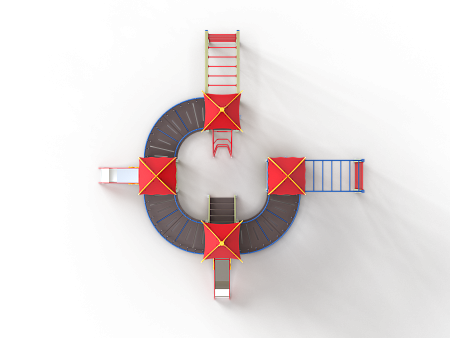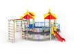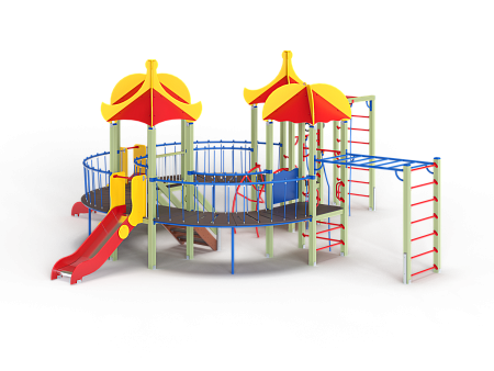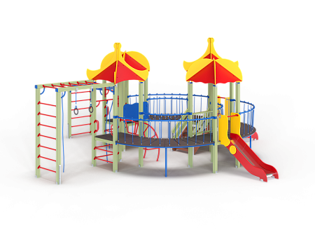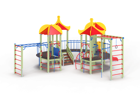Детский игровой комплекс состоит из четырёх последовательно соединённых по окружности башен с крышами. На первой башне установлены шведские стенки, ручки вспомогательные, перекладина с канатами и внешняя шведская стенка с усиленным рукоходом. На второй башне установлены лестница и горка. На третьей башне установлены горка и фанерное ограждение. На четвертой башне установлены лиана, перекладина с канатом, вспомогательные ручки и гимнастический комплекс с кронштейнами с канатом и кольцами гимнастическими. Первая, вторая, третья и четвертая башни соединены дугообразными мостами.