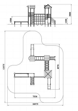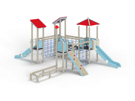Детский игровой комплекс состоит из четырёх башен. На первой башне установлены крыша наклонная, ограждение из бруса, шест, перекладина и горка. На второй башне установлены крыша наклонная, ограждение из бруса, перекладина и лестница. На третьей башне установлены крыша четырехскатная, горка, перекладина и четыре ограждения из бруса. На четвёртой башне установлены три ограждения из бруса, пять перекладин, декоративные флажки и трап из бруса с альпинистскими камнями Первая и вторая башни соединены полипропиленовым переходом, вторая и третья башни соединены мостом подвесным из деревянного бруса и полипропиленового каната, третья и четвёртая башни соединены сеткой полипропиленовой.