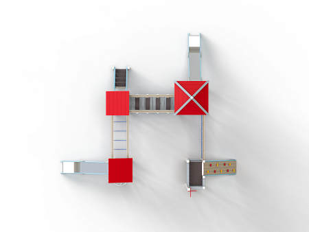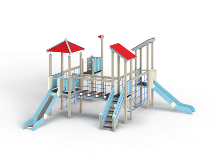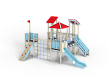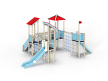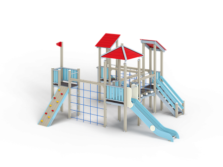 Детский игровой комплекс состоит из четырёх башен. На первой башне установлены крыша наклонная, ограждение из бруса, шест, перекладина и горка. На второй башне установлены крыша наклонная, ограждение из бруса, перекладина и лестница. На третьей башне установлены крыша четырехскатная, горка, перекладина и четыре ограждения из бруса. На четвёртой башне установлены три ограждения из бруса, пять перекладин, декоративные флажки и трап из бруса с альпинистскими камнями  Первая и вторая башни соединены полипропиленовым переходом, вторая и третья башни соединены мостом подвесным из деревянного бруса и полипропиленового каната, третья и четвёртая башни соединены сеткой полипропиленовой.