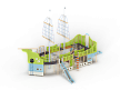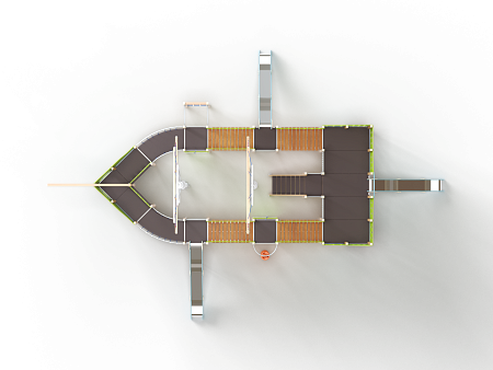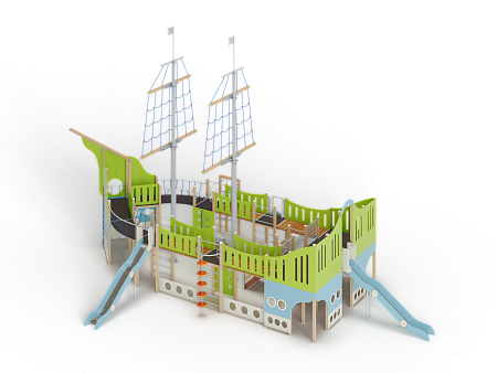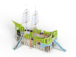 Детский игровой комплекс скомпонован в форме корабля с двумя металлическими мачтами. На боковых частях и на кормовой части установлены три горки. По периметру корабля расположены альпинистские стенки с перекладинами и канатами, фанерные ограждения с декоративными накладками, вынесенная сетка полипропиленовая, две полипропиленовые лестницы, шест с пластиковыми колесами, мосты прямые с фанерными перилами и мосты подвесные.