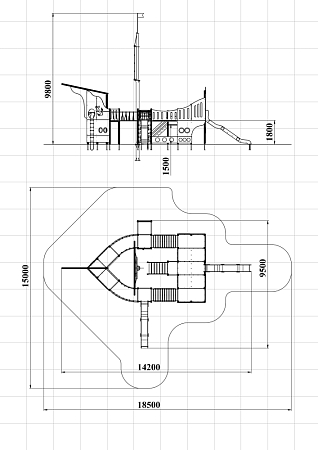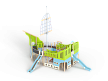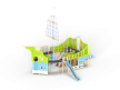 Детский игровой комплекс скомпонован в форме корабля с одной металлической мачтой. На боковой части и на кормовой части установлены две горки. По периметру корабля расположены альпинистская стенка с перекладинами и канатами, фанерные ограждения с декоративными накладками, вынесенная сетка полипропиленовая, две полипропиленовые лестницы, мосты прямые с фанерными перилами и мосты подвесные.