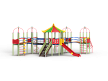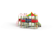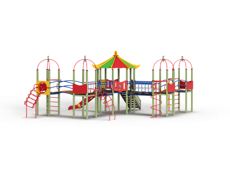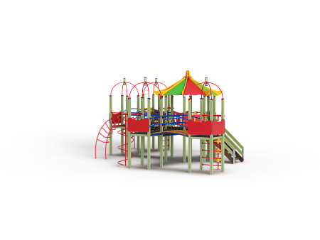 Детский игровой комплекс состоит из пяти башен. На одной башне установлена крыша в форме восьмигранной пагоды, на четырёх крыша металлическая со столбом. На восьмиграной башне установлена горка, лестница и фанерные ограждения. На башнях с металлической крышей установлены шест, шест спираль, шест с пластиковыми колесами, спираль, ограждение с круглым лазом, лиана, ручки вспомогательные, фанерные ограждения. Башни соединены двумя подвесными мостам и двумя мостами радиусными с металлическими перилами.