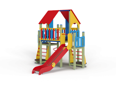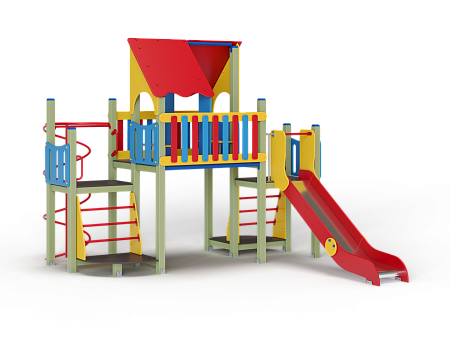 Детский игровой комплекс состоит из трех разновысоких башен. На первой башне установлена лестница, горка, фанерное ограждение и ручки вспомогательные. На второй сдвоенной башне, установлены фанерные ограждения и крыша. На третьей башне установлены ограждение, шест спираль, лестница и ручки вспомогательные.