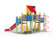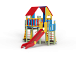 Детский игровой комплекс состоит из трех разновысоких башен. На первой башне установлена лестница, горка, фанерное ограждение и ручки вспомогательные. На второй сдвоенной башне, установлены фанерные ограждения и крыша. На третьей башне установлены ограждение, шест спираль, лестница и ручки вспомогательные.