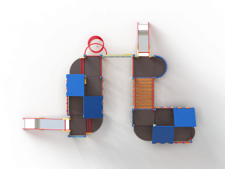 Детский игровой комплекс состоит из шести разновысоких башен. На первой башне установлена лестница, горка, фанерное ограждение и ручки вспомогательные. На второй сдвоенной башне, установлены фанерные ограждения и крыша. На третьей башне установлены фанерное ограждение, шест спираль, лестница и ручки вспомогательные. На четвертой башне установлены горка и балкон. На пятой башне установлено фанерное ограждение, лестница, вспомогательные ручки. На шестой сдвоенной установлены фанерные ограждения и крыша. Третья и четвертая башни соединены сеткой полипропиленовой, четвертая и пятая прямым мостом с фанерными перилами.