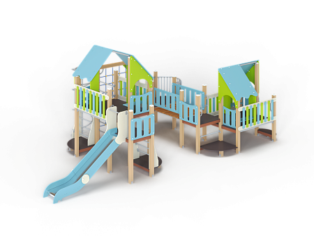 Детский игровой комплекс состоит из шести разновысоких башен. На первой башне установлена лестница, горка, фанерное ограждение и ручки вспомогательные. На второй сдвоенной башне, установлены фанерные ограждения и крыша. На третьей башне установлены фанерное ограждение, шест спираль, лестница и ручки вспомогательные. На четвертой башне установлены горка и балкон. На пятой башне установлено фанерное ограждение, лестница, вспомогательные ручки. На шестой сдвоенной установлены фанерные ограждения и крыша. Третья и четвертая башни соединены сеткой полипропиленовой, четвертая и пятая прямым мостом с фанерными перилами.