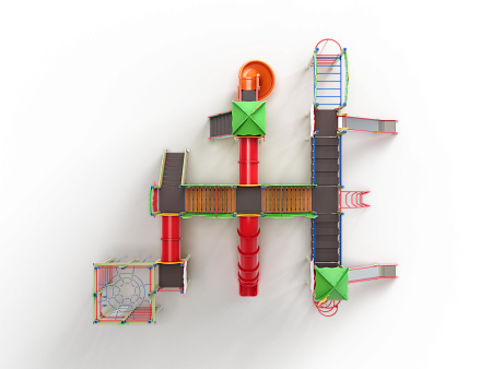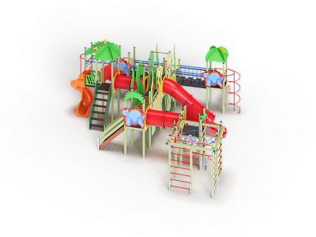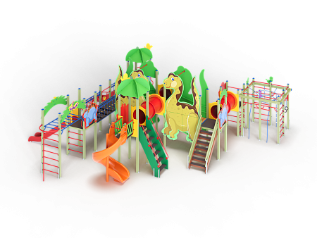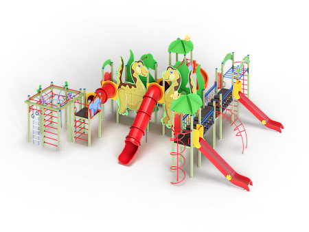 Детский игровой комплекс состоит из семи башен. На первой башне установлены шест спираль, ручки вспомогательные, горка, ограждение фанерное в форме динозавра и крыша. На второй башне установлена лиана наклонная. На третьей башне горка, фанерное ограждение в форме динозавра, перекладина и ручки вспомогательные. Третья башня имеет продолжение в виде гимнастического комплекса состоящего из рукохода, шеста, декоративных накладок и шведской стенки. На четвертой башне установлена пластиковая горка-труба. На пятой башне установлено фанерное ограждение в форме динозавра и лестница. На шестой башне установлены фанерное ограждение в форме динозавра, шведская стенка и ручки вспомогательные. Шестая башня имеет продолжение в виде гимнастического комплекса состоящего из: сетки полипропиленовой, декором в виде динозавриков, перекладин с полипропиленово лестницей, канатами и кольцами гимнастическими, шведских стенок. На седьмой (двухуровневой) башне установлена крыша, фанерные ограждения в форме динозавра, горка пластиковая винтовая, лестница. Первая и вторая башня соединены подвесным качающимся мостом, вторая и третья подвесным качающимся мостом, четвертая и вторая, четвертая и пятая наклонным мостом с металлическими перилами на которые установлены накладки с ручной художественной росписью в виде динозавра, пятая и шестая пластиковой трубой переходом, четвертая и седьмая пластиковой трубой переходом.