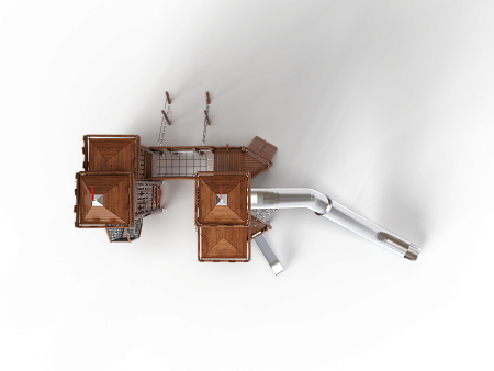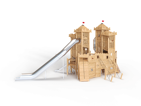 Комплекс выполнен в виде деревянного замка, состоящего из двух башен. Башни соединены канатным переходом. Башни имеют несколько ярусов со страховочными сетками и канатами, препятствующих свободному падению. На первой башне установлены горка из нержавеющей стали, трап наклонный с камнями для лазания, пушка и крыша. На второй башне установлены, трап с канатом, пушка, крыша и горка-труба из нержавеющей стали. С внешней стороны замка установлены два деревянных столба, к которым крепятся две лестницы, ведущие к ограждению канатного перехода в замке.