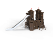 Комплекс выполнен в виде деревянного замка, состоящего из двух башен. Башни соединены канатным переходом. Башни имеют несколько ярусов со страховочными сетками и канатами, препятствующих свободному падению. На первой башне установлены горка из нержавеющей стали, трап наклонный с камнями для лазания, пушка и крыша. На второй башне установлены, трап с канатом, пушка, крыша и горка-труба из нержавеющей стали. С внешней стороны замка установлены два деревянных столба, к которым крепятся две лестницы, ведущие к ограждению канатного перехода в замке.