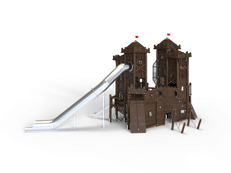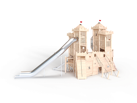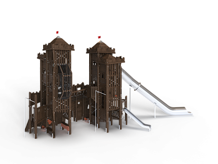 Комплекс выполнен в виде деревянного замка, состоящего из двух башен. Башни соединены канатным переходом. Башни имеют несколько ярусов со страховочными сетками и канатами, препятствующих свободному падению. На первой башне установлены горка из нержавеющей стали, трап наклонный с камнями для лазания, пушка и крыша. На второй башне установлены, трап с канатом, пушка, крыша и горка-труба из нержавеющей стали. С внешней стороны замка установлены два деревянных столба, к которым крепятся две лестницы, ведущие к ограждению канатного перехода в замке.