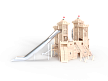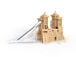 Комплекс выполнен в виде деревянного замка, состоящего из двух башен. Башни соединены канатным переходом. Башни имеют несколько ярусов со страховочными сетками и канатами, препятствующих свободному падению. На первой башне установлены горка из нержавеющей стали, трап наклонный с камнями для лазания, пушка и крыша. На второй башне установлены, трап с канатом, пушка, крыша и горка-труба из нержавеющей стали. С внешней стороны замка установлены два деревянных столба, к которым крепятся две лестницы, ведущие к ограждению канатного перехода в замке.