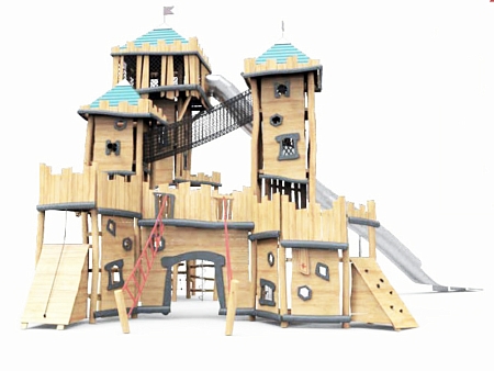 Комплекс выполнен в виде деревянного замка, состоящего из трех башен. Башни соединены канатным переходом. Башни имеют несколько ярусов со страховочными сетками и канатами, препятствующих свободному падению. На первой башне установлены трап наклонный с камнями для лазания, пушка и крыша. На второй башне установлены, трап с канатом, пушка и крыша. На третьей башне установлены сетка, пушка, крыша, шест и горка-труба из нержавеющей стали. С внешней стороны замка установлены два деревянных столба, к которым крепятся две лестницы, ведущие к ограждению канатного перехода в замке.