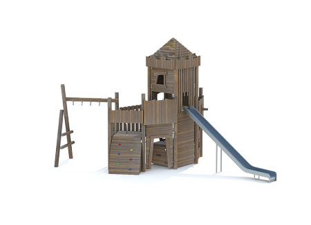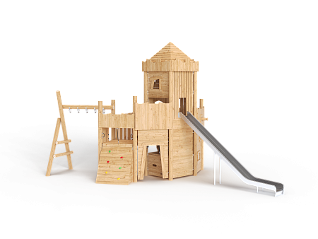 Комплекс выполнен в виде деревянного замка с башней. На башне установлены горка из нержавеющей стали, трап наклонный с камнями для лазания, пушка, ручки, крыша, сетки и балкон. С боковой стороны замка установлен гимнастический комплекс из брёвен и мкталлических ручек, в виде рукохода.