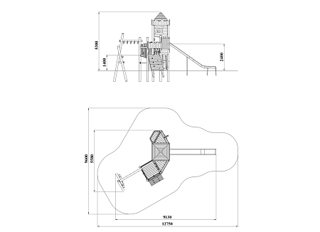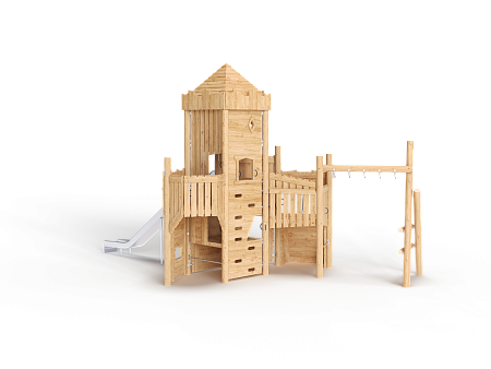 Комплекс выполнен в виде деревянного замка с башней. На башне установлены горка из нержавеющей стали, трап наклонный с камнями для лазания, пушка, ручки, крыша, сетки и балкон. С боковой стороны замка установлен гимнастический комплекс из брёвен и мкталлических ручек, в виде рукохода.