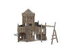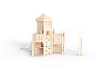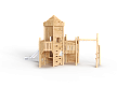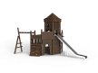 Комплекс выполнен в виде деревянного замка с башней. На башне установлены горка из нержавеющей стали, трап наклонный с камнями для лазания, пушка, ручки, крыша, сетки и балкон. С боковой стороны замка установлен гимнастический комплекс из брёвен и мкталлических ручек, в виде рукохода.