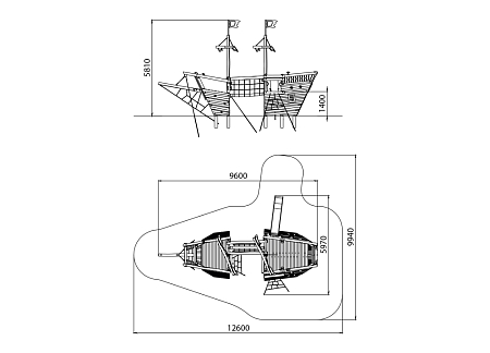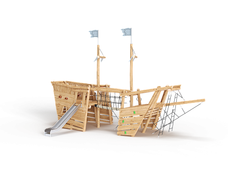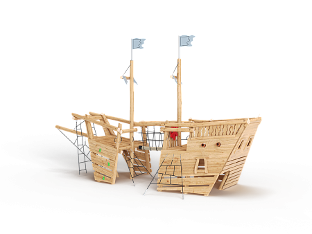 Комплекс выполнен в виде комбинации деревянных столбов и сеток, в совокупности образующих остов корабля с двумя мачтами и двумя башнями с площадками. Башни соединены подвесным бревном.. Обшивка корабля выполнена из деревянного бруса. На задней части корабля установлены пушки, сетка и горка из нержавеющей стали. На носовой части корабля установлены ручки, лестницы канатные и канатный обвес.