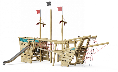Комплекс выполнен в виде комбинации деревянных столбов и сеток, в совокупности образующих остов корабля с тремя мачтами и двумя башнями с площадками. Башни соединены подвесным бревном. Обшивка коробля выполнена из деревянного бруса. На задней части корабля установлены пушки, сетка и горка из нержавеющей стали. На носовой части корабля установлены ручки, лестницы канатные, сетки и канатный обвес. В центре корабля расположен столик с "раковиной" под песок и подвижное приспособление для транспортировки песка с области грунта на столик.