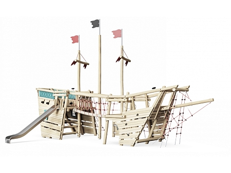 Комплекс выполнен в виде комбинации деревянных столбов и сеток, в совокупности образующих остов корабля с тремя мачтами и двумя башнями с площадками. Башни соединены подвесным бревном. Обшивка коробля выполнена из деревянного бруса. На задней части корабля установлены пушки, сетка и горка из нержавеющей стали. На носовой части корабля установлены ручки, лестницы канатные, сетки и канатный обвес. В центре корабля расположен столик с "раковиной" под песок и подвижное приспособление для транспортировки песка с области грунта на столик.