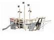 Комплекс выполнен в виде комбинации деревянных столбов и сеток, в совокупности образующих остов пиратского корабля с тремя мачтами и двумя башнями с площадками. Башни соединены подвесным бревном. Обшивка коробля выполнена из деревянного бруса. На задней части корабля установлены пушки, сетка и горка из нержавеющей стали. На носовой части корабля установлены ручки, лестницы канатные, сетки и канатный обвес. В центре корабля расположен столик с "раковиной" под песок и подвижное приспособление для транспортировки песка с области грунта на столик.